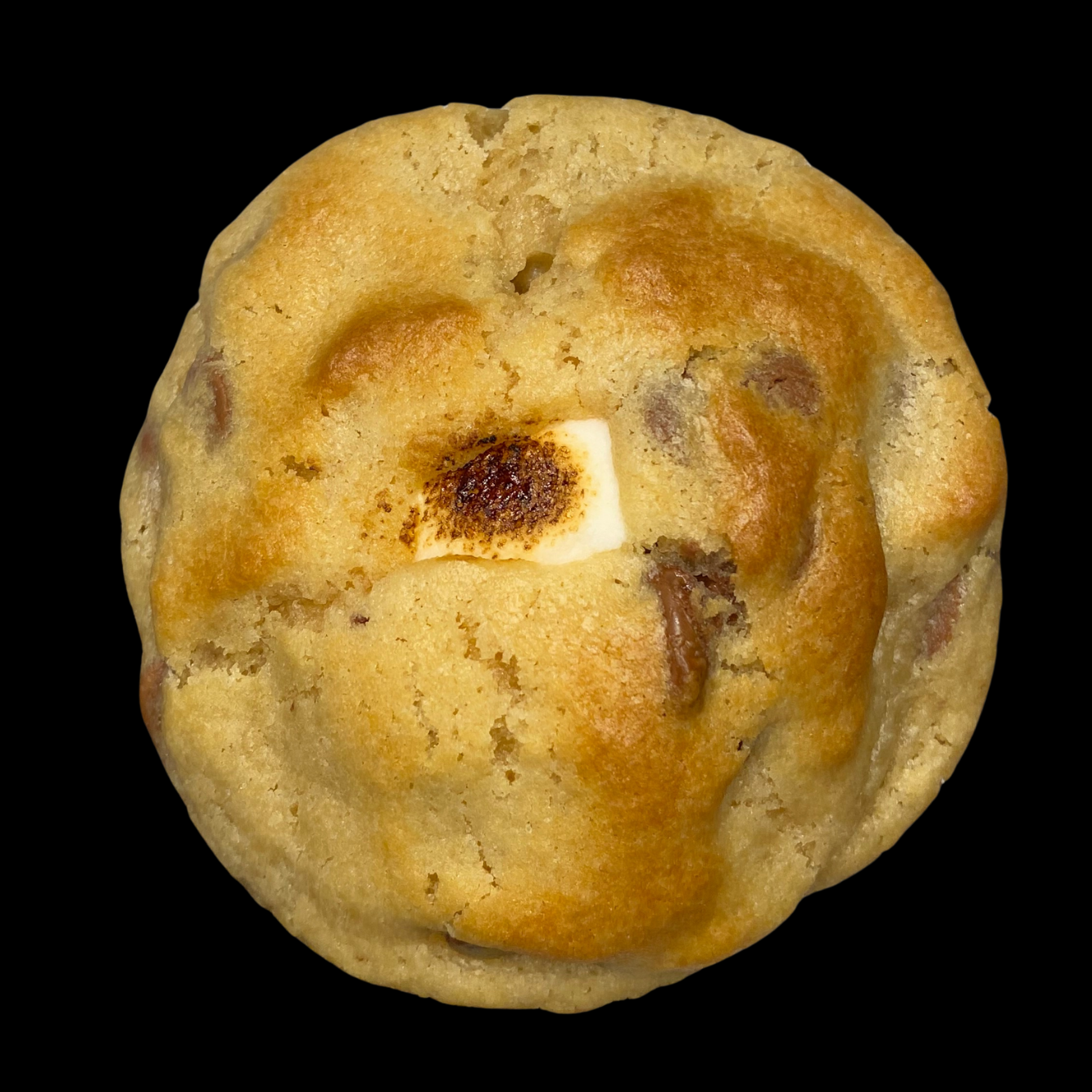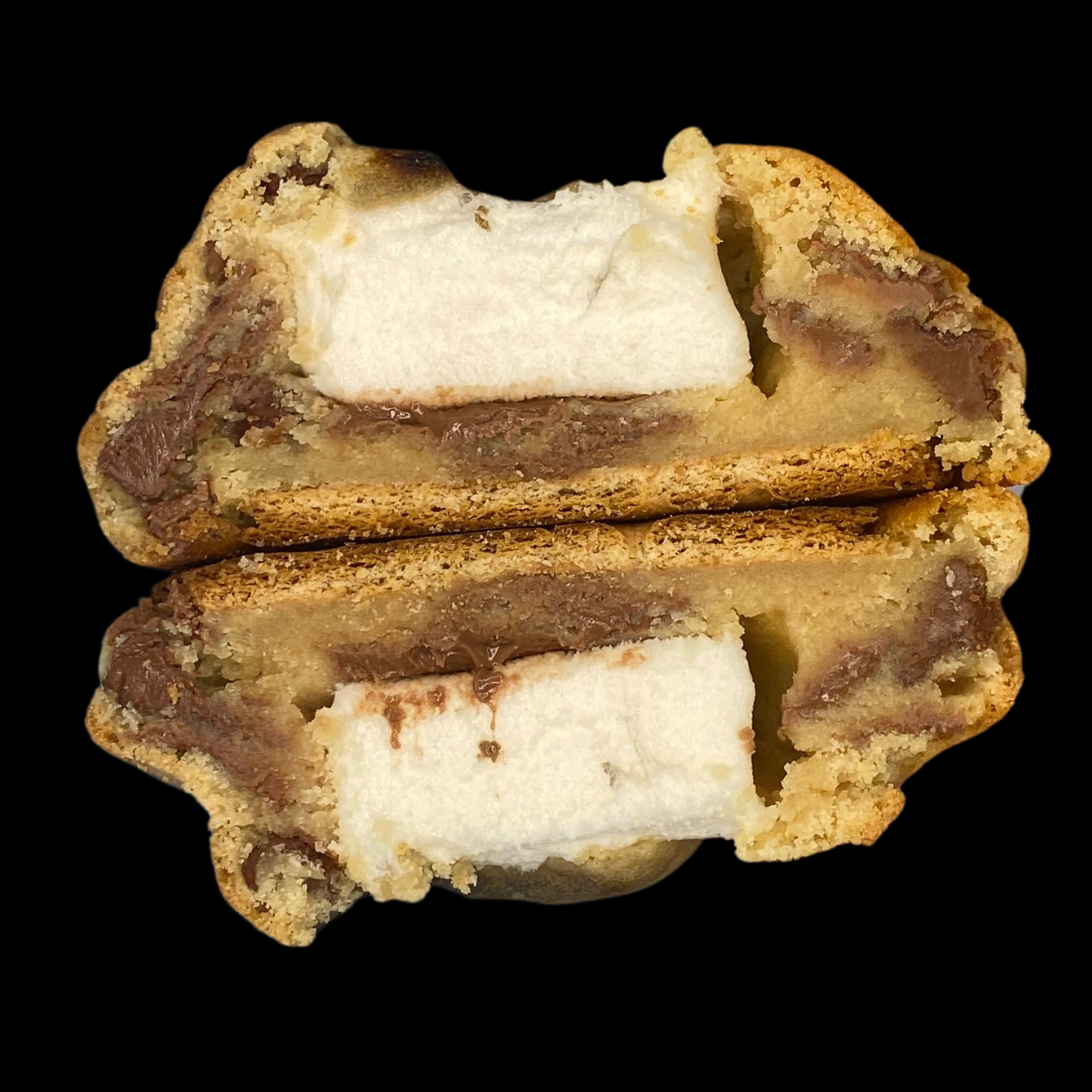All the nostalgia of a campfire classic, baked into one epic cookie. Soft, buttery dough with a graham cracker base, stuffed with gooey roasted marshmallow and rich Belgian chocolate that melts right into every bite. It’s the cozy, chocolatey, toasty flavor of s’mores — no campfire required.